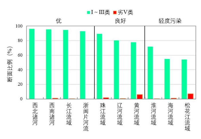 1-7月,長(zhǎng)江、黃河、珠江、松花江、淮河、海河、遼河等七大流域及西北諸河、西南諸河和浙閩片河流水質(zhì)優(yōu)良(Ⅰ~Ⅲ類)斷面比例為82.8%,同比上升0.4個(gè)百分點(diǎn);劣Ⅴ類斷面比例為1.5%,同比下降0.9個(gè)百分點(diǎn)。主要污染指標(biāo)為化學(xué)需氧量、高錳酸鹽指數(shù)和五日生化需氧量。其中,西北和西南諸河、長(zhǎng)江流域和浙閩片河流水質(zhì)為優(yōu);珠江、遼河和黃河流域水質(zhì)良好;淮河、海河和松花江流域?yàn)檩p度污染。