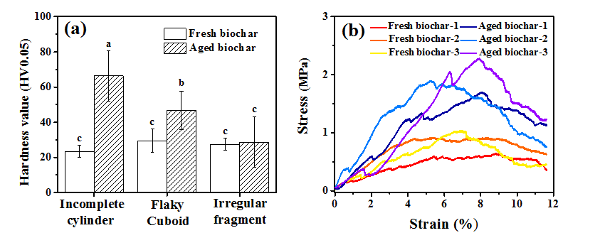 The results suggested the improvement of biochar particles’ mechanical strength after the field aging process, which would benefit the sequestration of particle internal structure and substances. The improvement of compressive strength of the aged biochar particles indicates that they might be able to withstand a higher mechanical pressure than the fresh biochar particles, leading to relative lower potential environmental risks, e.g., less fragmentation, less surface carbon loss, and more benefits for the microbial communities in the biochar particles.圖4. 機械性能分析