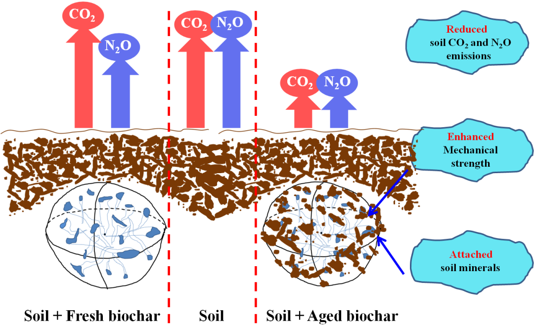 田間老化使生物炭表面積累礦物質(zhì),形成有機-礦物復(fù)合體,從而增強顆粒物理穩(wěn)定性(如機械強度),顯著減少土壤CO2和N2O排放。因此新鮮生物炭使用之前,通過人為或自然的方法去除不穩(wěn)定組分及構(gòu)建富含有機-礦物復(fù)合體的保護界面,對于增強其在土壤中固碳減排潛力具有重要意義。