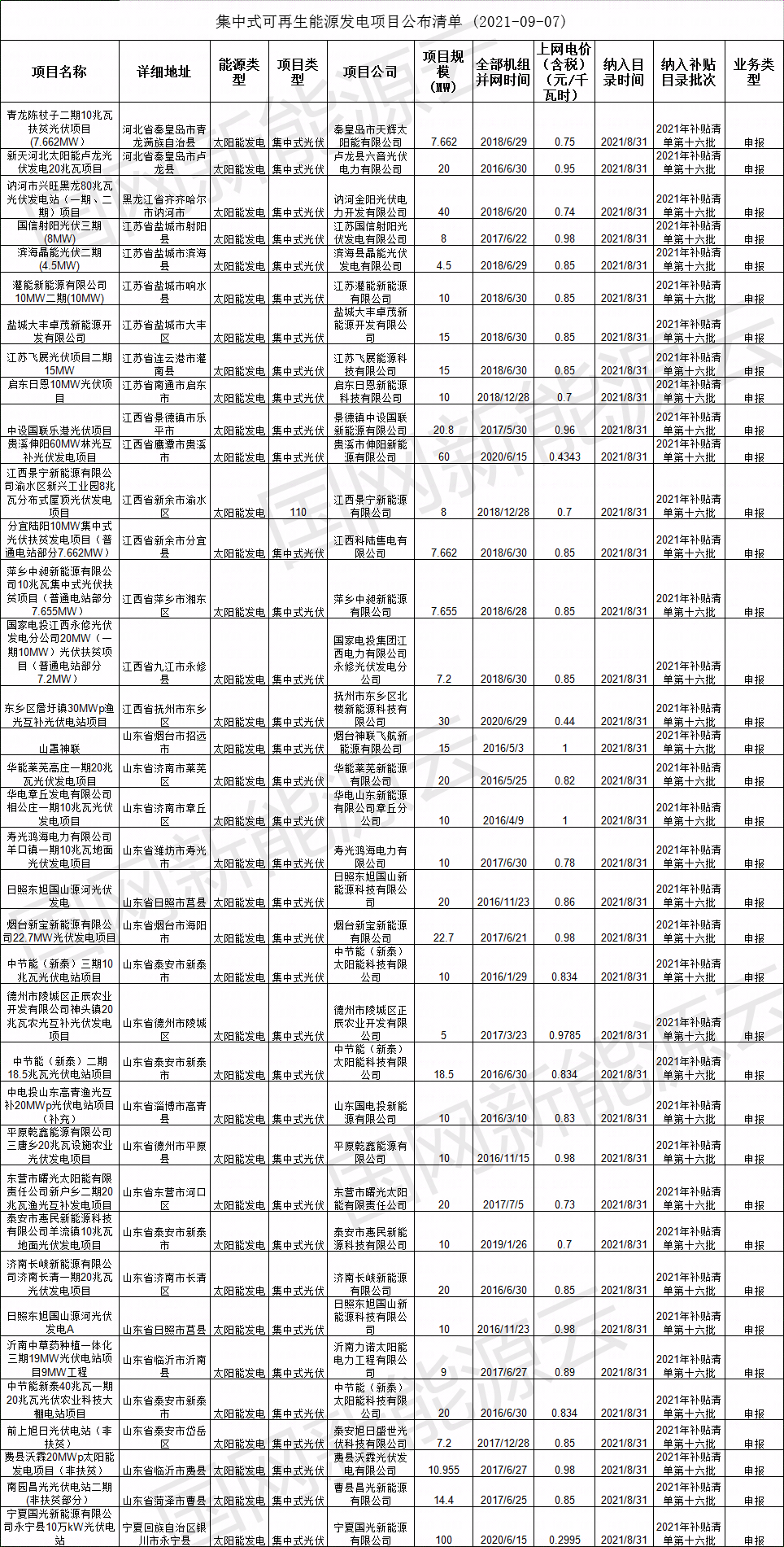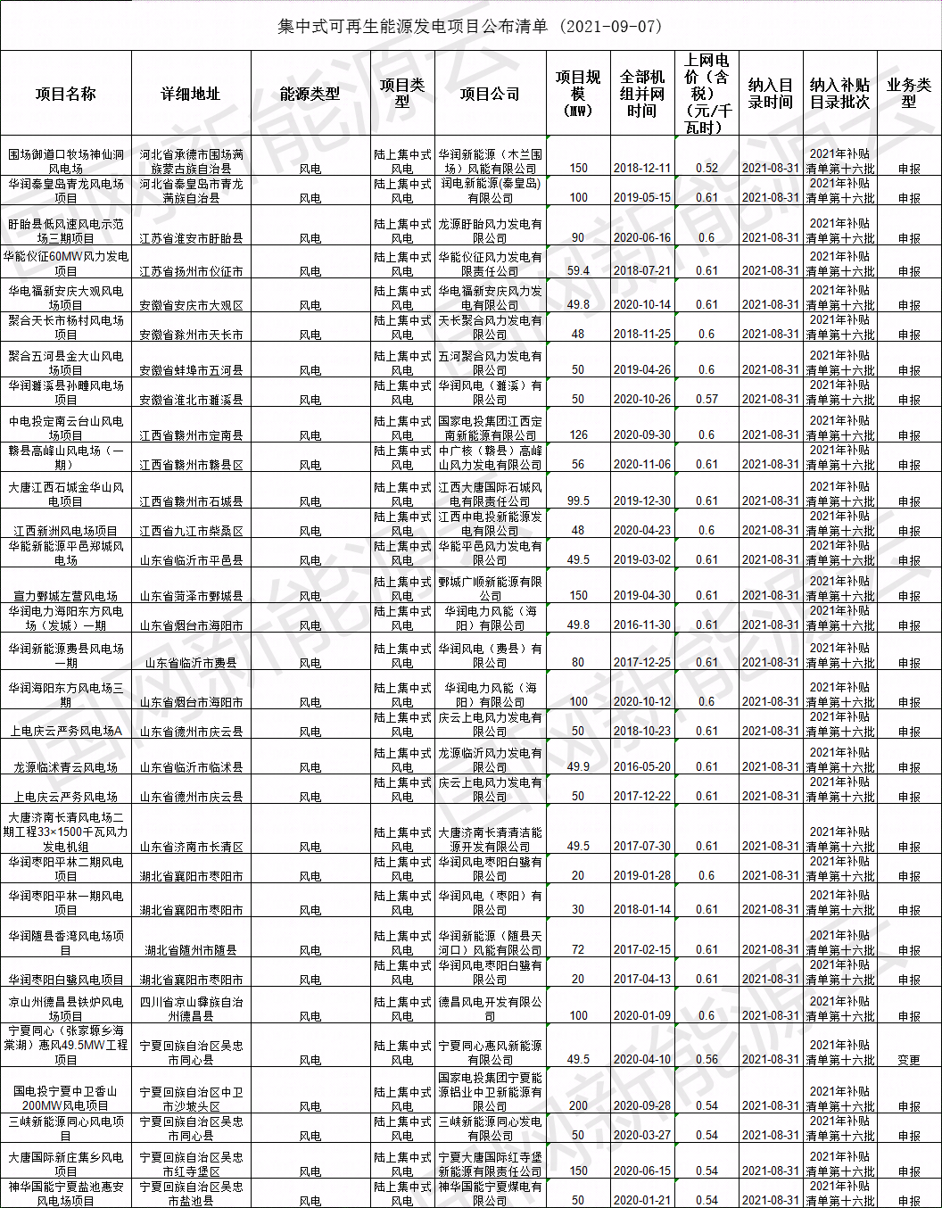 2021年8月31日,我公司已將完成公示的2021年第十六批可再生能源發(fā)電項(xiàng)目補(bǔ)貼項(xiàng)目清單上報(bào)國(guó)家主管部門,現(xiàn)將十六批可再生能源發(fā)電并網(wǎng)項(xiàng)目清單詳情盤點(diǎn)如下: