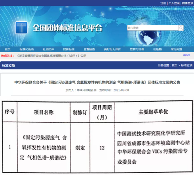為了貫徹落實(shí)《中華人民共和國標(biāo)準(zhǔn)化法》、國務(wù)院《深化標(biāo)準(zhǔn)化工作改革方案》、國家標(biāo)準(zhǔn)化管理委員會和民政部印發(fā)的《團(tuán)體標(biāo)準(zhǔn)管理規(guī)定》(國標(biāo)委聯(lián)〔2019〕1號)的文件精神;按照《中華環(huán)保聯(lián)合會團(tuán)體標(biāo)準(zhǔn)管理辦法(試行)》要求,經(jīng)中華環(huán)保聯(lián)合會立項(xiàng)批準(zhǔn),由中國測試技術(shù)研究院化學(xué)研究所、四川省成都市生態(tài)環(huán)境監(jiān)測中心站和中華環(huán)保聯(lián)合會VOCs污染防治專業(yè)委員會等單位共同發(fā)起的全國團(tuán)體標(biāo)準(zhǔn)《固定污染源廢氣 含氧揮發(fā)性有機(jī)物的測定 氣相色譜-質(zhì)譜法》起草制定工作現(xiàn)已啟動;按照流程,標(biāo)準(zhǔn)項(xiàng)目信息已獲得全國團(tuán)體標(biāo)準(zhǔn)信息平臺的立項(xiàng)公示。