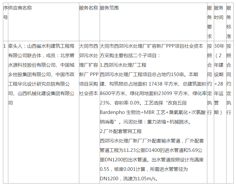 供應(yīng)商名稱:牽頭人:山西省水利建筑工程局有限公司聯(lián)合體,成員:北京碧水源科技股份有限公司、中國(guó)城鄉(xiāng)控股集團(tuán)有限公司、中國(guó)市政工程華北設(shè)計(jì)研究總院有限公司、山西機(jī)械化建設(shè)集團(tuán)有限公司