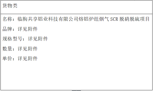 原標題:臨朐共享鋁業(yè)科技有限公司熔鋁爐組煙氣SCR脫硝脫硫項目中標公告