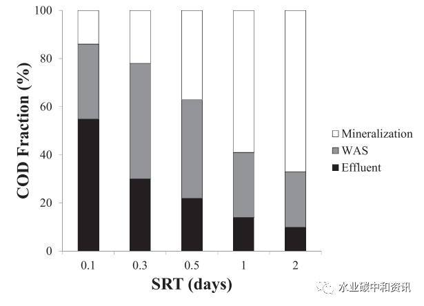 在較SRT和HRT下運(yùn)行時(shí),產(chǎn)量接近其最大值,因而可在接近最大污泥產(chǎn)率情況下,可最優(yōu)地利用COD產(chǎn)出生物質(zhì)。在這些運(yùn)行條件下,與傳統(tǒng)HRAS工藝相比,其去除大部分(50~80%)進(jìn)水COD時(shí)所需求的曝氣量減少近60%。