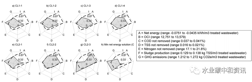 各類(lèi)方案中可持續(xù)指標(biāo)評(píng)價(jià)一項(xiàng)以可持續(xù)碳中和運(yùn)行為目標(biāo)的積極分析表明,淹沒(méi)式厭氧膜生物反應(yīng)器(AnMBR)可能是凈能量明顯的,有利于形成碳負(fù)污水管理(Pretel et al.)。在該分析中,利用定量可持續(xù)設(shè)計(jì)過(guò)程,使用技術(shù)、環(huán)境和經(jīng)濟(jì)標(biāo)準(zhǔn)評(píng)估了全部可行的設(shè)計(jì)方案,來(lái)完善AnMBR詳細(xì)設(shè)計(jì)。其中,集成了跨季節(jié)溫度穩(wěn)態(tài)性能建模(使用中試實(shí)驗(yàn)數(shù)據(jù)和模擬軟 DESASS)、生命周期成本分析(LCC)和生命周期評(píng)價(jià)(LCA)。
