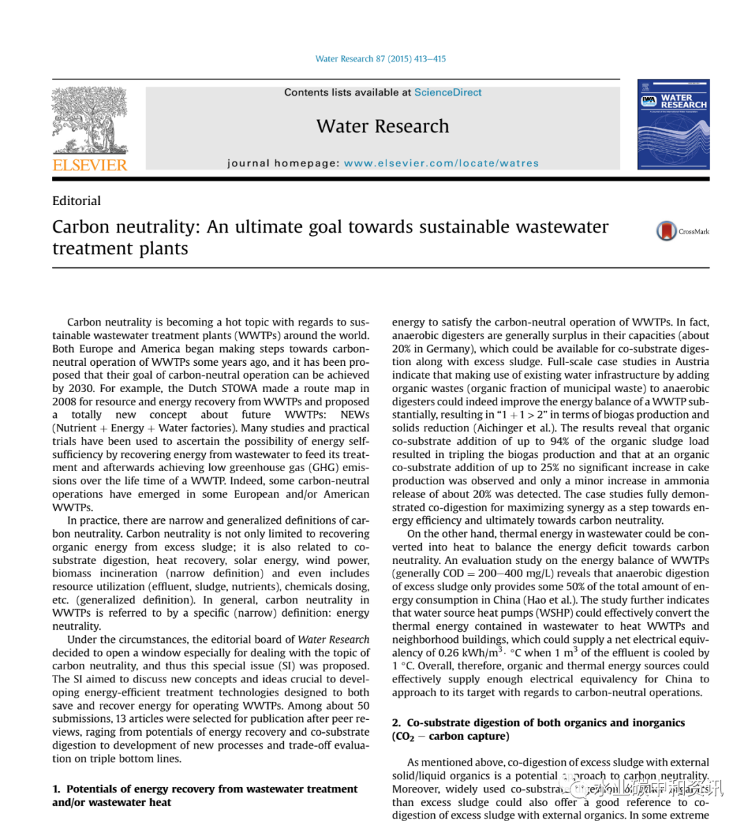 在這種環(huán)境下,《Water Research》編輯委員會(huì)決定開(kāi)辟以專(zhuān)研究碳中和為主題的窗口,特推出本期特刊。本刊旨在為開(kāi)發(fā)高效能源處理技術(shù),探討新理念和觀點(diǎn),旨在污水處理廠運(yùn)行節(jié)能與能源回收。從約50份投稿論文中,經(jīng)同行評(píng)審最后錄用其中13篇文章,內(nèi)容涵蓋了從能源回收與有機(jī)質(zhì)共消化到新工藝與設(shè)計(jì)方法開(kāi)發(fā),再到量化和指導(dǎo)可持續(xù)性工藝發(fā)展等多個(gè)角度。