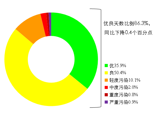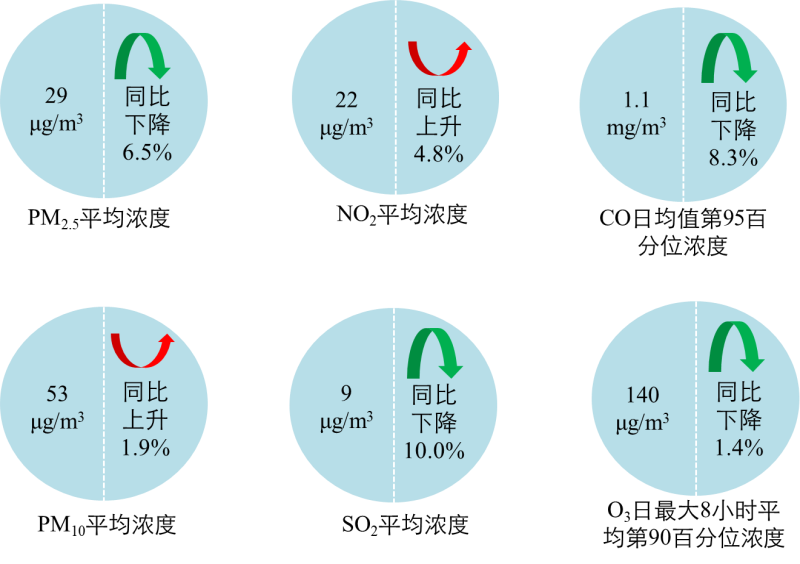 1-8月,全國339個地級及以上城市平均優(yōu)良天數(shù)比例為86.3%,同比下降0.4個百分點;PM2.5平均濃度為29微克/立方米,同比下降6.5%;PM10平均濃度為53微克/立方米,同比上升1.9%;O3平均濃度為140微克/立方米,同比下降1.4%;SO2平均濃度為9微克/立方米,同比下降10.0%;NO2平均濃度為22微克/立方米,同比上升4.8%;CO平均濃度為1.1毫克/立方米,同比下降8.3%。