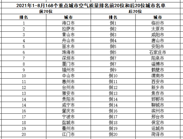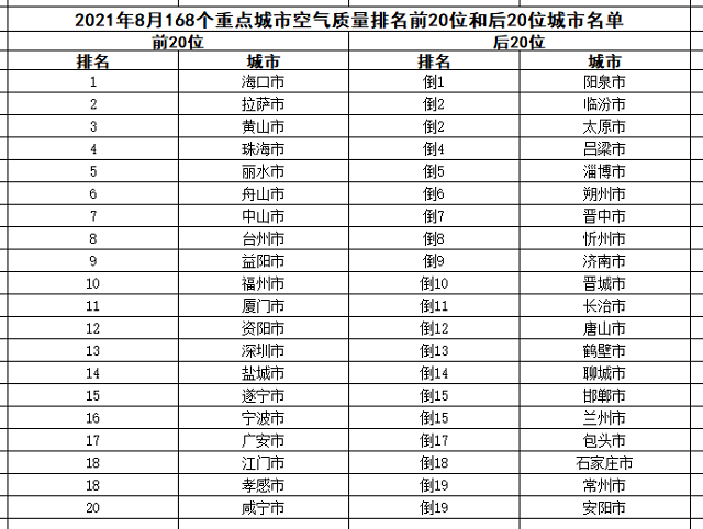 8月,168個重點城市中,???、拉薩和黃山市等20個城市空氣質(zhì)量相對較好(從第1名至第20名);陽泉、臨汾和太原市等20個城市空氣質(zhì)量相對較差(從倒數(shù)第1名至并列倒數(shù)第19名),見附表3。