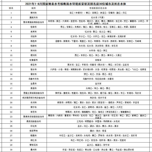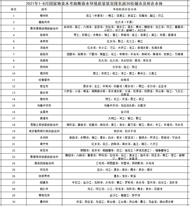 1-8月,全國地級及以上城市中,柳州、嘉峪關(guān)和黔東南州等30個城市國家地表水考核斷面水環(huán)境質(zhì)量相對較好(從第1名至第30名),烏蘭察布、赤峰和呂梁市等30個城市國家地表水考核斷面水環(huán)境質(zhì)量相對較差(從倒數(shù)第1名至倒數(shù)第30名)。見附表1和附表2。