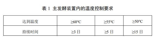 c)主發(fā)酵裝置內(nèi)的溫度及持續(xù)時(shí)間應(yīng)滿足表1的要求。采用密閉式堆肥反應(yīng)器時(shí),宜在反應(yīng)器中心與距反應(yīng)器內(nèi)壁100 mm處各設(shè)2個(gè)測(cè)溫點(diǎn),溫度按測(cè)溫點(diǎn)均值計(jì),溫度需連續(xù)記錄。采用半密閉式和敞開條垛或槽式堆肥時(shí),宜在條垛或槽式堆肥的長(zhǎng)度方向每間隔5m橫截面的中心與距表面和底部100 mm處各設(shè)1個(gè)測(cè)溫點(diǎn),溫度按測(cè)溫點(diǎn)均值計(jì),間隔2小時(shí)記錄溫度1次。