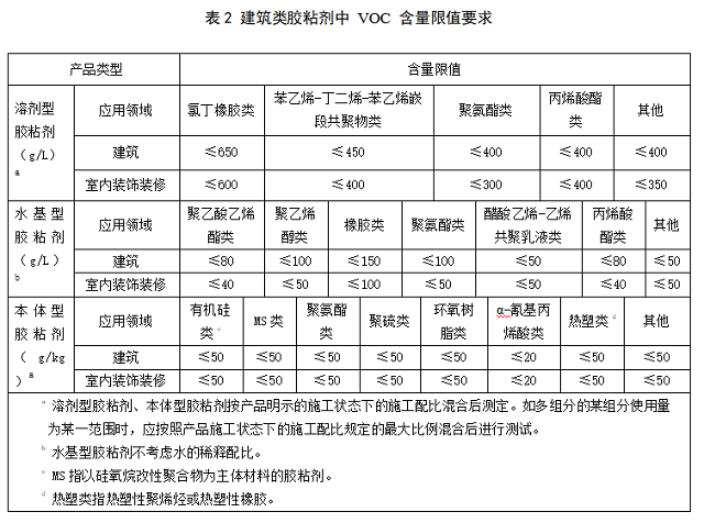 5.2 建筑類膠粘劑中 VOC 含量限值應(yīng)符合表 2 的要求。
