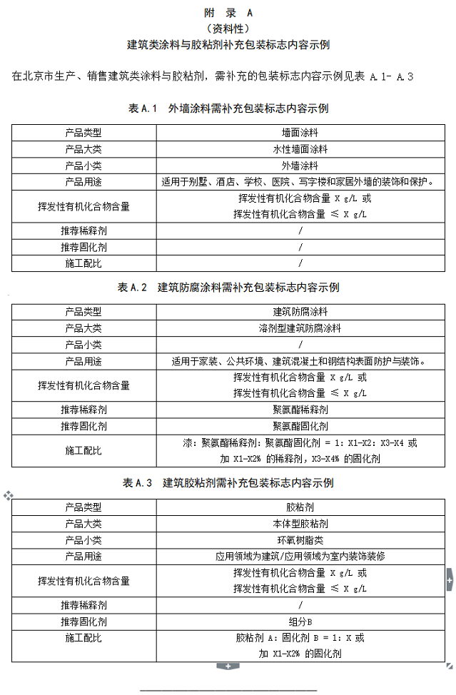 在北京市生產(chǎn)、銷售本文件規(guī)定的產(chǎn)品,除原有產(chǎn)品說明外,需要在包裝標(biāo)志上補(bǔ)充標(biāo)明以下內(nèi)容,示例參照附錄 A: