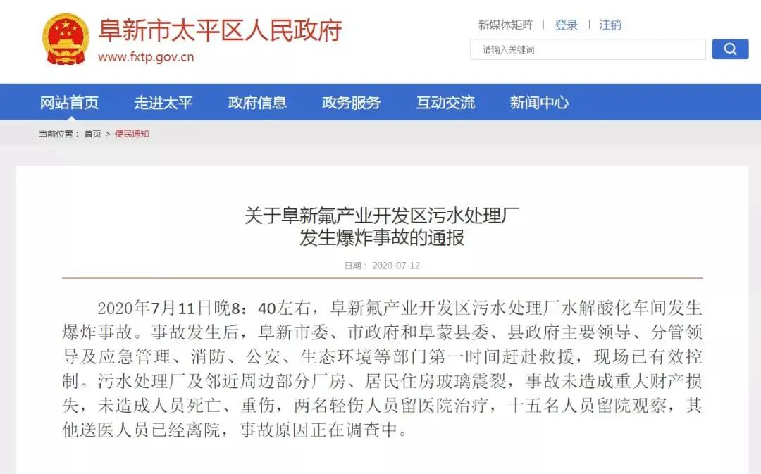 事故發(fā)生后,阜新市委、市政府和阜蒙縣委、縣政府主要領(lǐng)導(dǎo)、分管領(lǐng)導(dǎo)及應(yīng)急管理、消防、公安、生態(tài)環(huán)境等部門第一時(shí)間趕赴救援,現(xiàn)場已有效控制。污水處理廠及鄰近周邊部分廠房、居民住房玻璃震裂,事故未造成重大財(cái)產(chǎn)損失,未造成人員死亡、重傷,2名輕傷人員留醫(yī)院治療,15名人員留院觀察,其他送醫(yī)人員已經(jīng)離院,事故原因正在調(diào)查中。經(jīng)過調(diào)查,2020年9月28日,阜新市應(yīng)急管理局發(fā)布了《阜新氟產(chǎn)業(yè)開發(fā)區(qū)碧波污水處理廠“7.11”一般爆炸事故調(diào)查報(bào)告》,對事故的原因做出了認(rèn)定。
