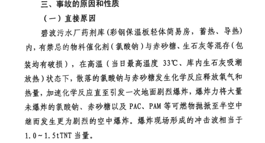 而之所以發(fā)生爆炸,正是與這些氯酸鈉有關(guān)。原來,碧波污水廠的藥劑庫為彩鋼保溫板輕體簡易房,容易蓄熱、導(dǎo)熱。由于里面儲(chǔ)存的氯酸鈉、赤砂糖、生石灰等化學(xué)品混存,且包裝均有破損。結(jié)果在高溫的狀態(tài)下,散落的氯酸鈉與赤砂糖發(fā)生化學(xué)反應(yīng),引發(fā)了第一次地面劇烈爆炸。