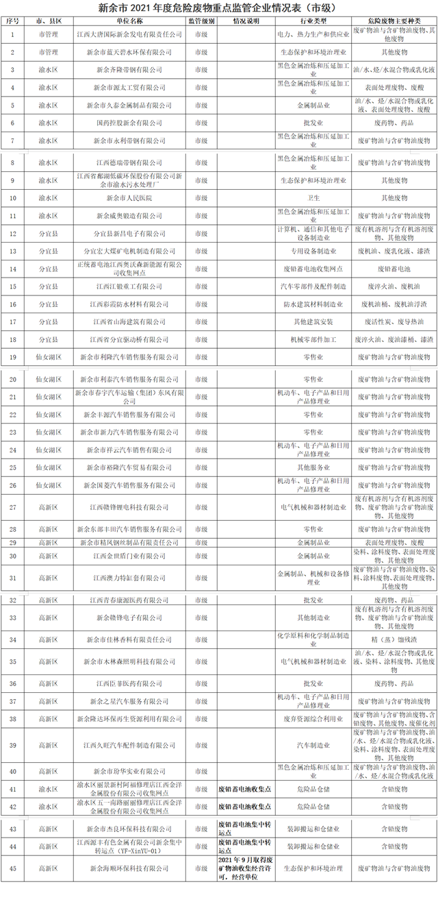 關(guān)于發(fā)布新余市危險廢物重點監(jiān)管企業(yè)(2021年更新)的公告