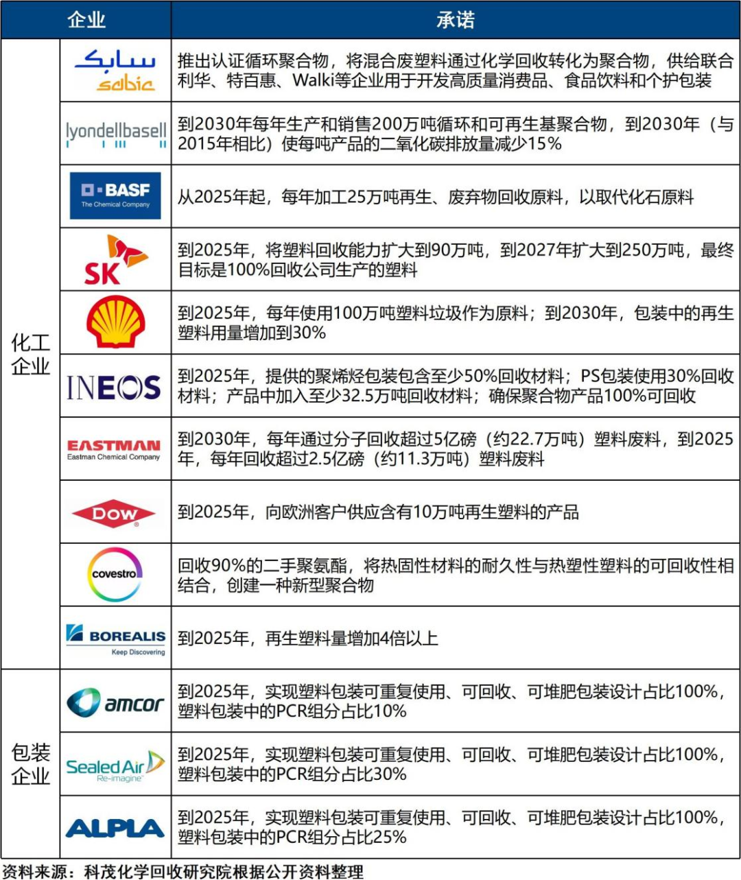 2.以BASF、SABIC、陶氏等化工巨頭為主要成員的40多家國際企業(yè)建立“終結塑料廢棄物聯(lián)盟(AEPW)”,承諾投入15億美元,幫助終結環(huán)境中的塑料垃圾,同時承諾為客戶提供PCR塑料。建立和擴充PCR塑料產能和產業(yè)鏈,成為近幾年化工巨頭的重要戰(zhàn)略。