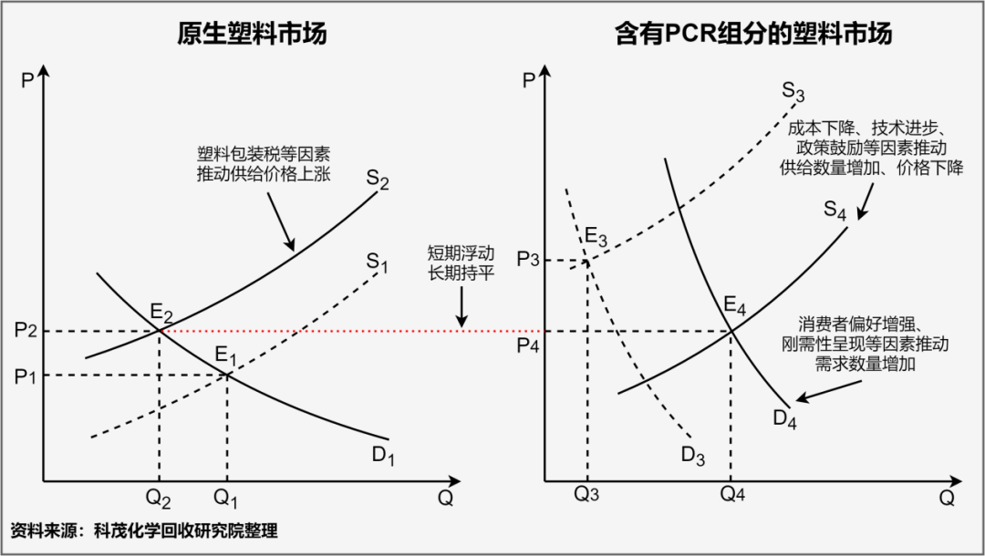 過去含PCR組分塑料的理論均衡價格P3遠大于原生塑料價格P1,客戶在經濟上理性選擇傾向于購買和使用原生塑料。現(xiàn)在隨著各項供需因素的影響,客戶“使用100%原生塑料”的代價P2和“使用PCR組分塑料”的代價P4開始接近。未來某些供需因素改變可能會在短期內打破均衡,但長期來看,兩者價格會相對持平。