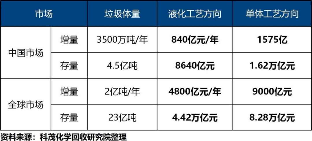 3.廢塑料化學回收的市場空間巨大,每年新增市場潛力在千億級別,存量市場在萬億級別。