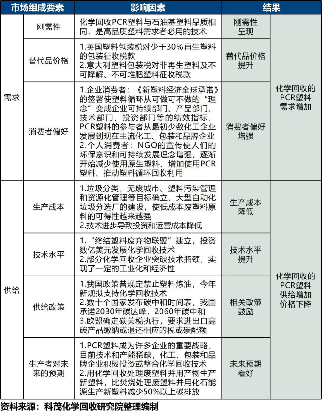 2.近年在政策強力作用下,剛性需求呈現(xiàn)、100%原生塑料稅收增加、消費者環(huán)保偏好增強,使化學回收PCR塑料需求大幅增加;技術水平提升、相關政策鼓勵、未來預期看好,化學回收PCR塑料潛在供給能力增加,使化學回收PCR塑料市場出現(xiàn)并迅速升溫;