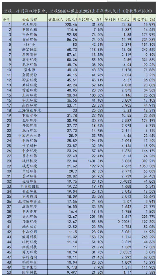 據(jù)不完全統(tǒng)計,2021年上半年近200家上市主營環(huán)保企業(yè)中營收和凈利雙增長企業(yè)共有122家,現(xiàn)對其中營收50強企業(yè)財務指標數(shù)據(jù)進行一一盤點。