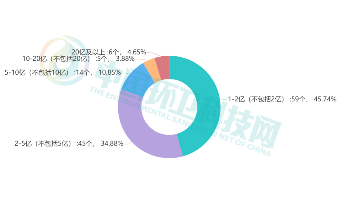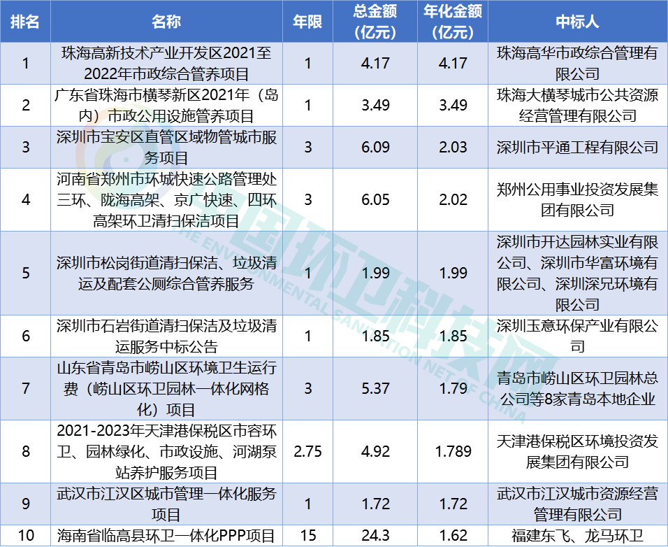 據(jù)統(tǒng)計(jì),9個(gè)月內(nèi)共有129個(gè)億級(jí)環(huán)衛(wèi)項(xiàng)目開標(biāo),總金額達(dá)561.33億元。單個(gè)項(xiàng)目中標(biāo)金額最高達(dá)47.27億,年化金額最高為3.49億/年,項(xiàng)目來自25個(gè)省/直轄市/自治區(qū),其中廣東省開標(biāo)個(gè)數(shù)最多,安徽省開標(biāo)總金額最高。來源 | 環(huán)衛(wèi)科技網(wǎng)(ID: cnhuanwei)9個(gè)月的激烈競(jìng)爭(zhēng)之后,2021年環(huán)衛(wèi)市場(chǎng)即將迎來最后的沖刺期。縱觀前三季度,民企收獲滿滿的同時(shí),國資來勢(shì)兇猛,屢次拿下億級(jí)項(xiàng)目,更有一部分國企憑借手中的大型項(xiàng)目躋身2021年前三季度拿標(biāo)top10。同時(shí),各大頭部環(huán)企在垃圾分類、海上環(huán)衛(wèi)業(yè)務(wù)等方面各有突破,業(yè)態(tài)布局走向更豐富多元。據(jù)統(tǒng)計(jì),9個(gè)月內(nèi)共有129個(gè)億級(jí)環(huán)衛(wèi)項(xiàng)目開標(biāo),總金額達(dá)561.33億元。單個(gè)項(xiàng)目中標(biāo)金額最高達(dá)47.27億,年化金額最高為3.49億/年,項(xiàng)目來自25個(gè)省/直轄市/自治區(qū),其中廣東省開標(biāo)個(gè)數(shù)最多,安徽省開標(biāo)總金額最高。1月-9月億級(jí)環(huán)衛(wèi)項(xiàng)目中標(biāo)個(gè)數(shù)分別為21個(gè)、14個(gè)、20個(gè)、13個(gè)、9個(gè)、14個(gè)、15個(gè)、8個(gè)、15個(gè),中標(biāo)金額分別為184.89億元、57.67億元、58.71億元、32.39億元、21.62億元、52.36億元、66.94億元、44.15億元、42.6億元。1、數(shù)據(jù)來源于中國政府采購網(wǎng)及各地方政府采購網(wǎng);2、版權(quán)歸環(huán)衛(wèi)科技網(wǎng)所有,未經(jīng)書面授權(quán),禁止轉(zhuǎn)載。在一月份高達(dá)184.89億總開標(biāo)金額的襯托下,后面8個(gè)月顯得尤其低調(diào),其中以五月份開標(biāo)項(xiàng)目最少、總金額最低。9個(gè)月來,億級(jí)項(xiàng)目的個(gè)數(shù)、金額整體都呈下降趨勢(shì),與第二季度相比,第三季度整體略有回溫。在開標(biāo)的129個(gè)項(xiàng)目中,以中標(biāo)金額為標(biāo)準(zhǔn)劃分,1-2億及2-5億元的項(xiàng)目分別有59個(gè)、45個(gè),也就是說,5億以下的項(xiàng)目占據(jù)了總項(xiàng)目個(gè)數(shù)的80.62%。同時(shí),10億以上的項(xiàng)目僅為11個(gè),占全部項(xiàng)目的8.53%。1、數(shù)據(jù)來源于中國政府采購網(wǎng)及各地方政府采購網(wǎng);2、版權(quán)歸環(huán)衛(wèi)科技網(wǎng)所有,未經(jīng)書面授權(quán),禁止轉(zhuǎn)載。截至9月底,今年總服務(wù)費(fèi)最高的項(xiàng)目為1月發(fā)布的安徽省六安市舒城縣城鄉(xiāng)環(huán)衛(wèi)一體化特許經(jīng)營項(xiàng)目,服務(wù)期30年,總服務(wù)費(fèi)超47億元,中標(biāo)人為人和環(huán)境、軒昂環(huán)保。與2020年相比,今年還未出現(xiàn)能與新橋和沙井街道環(huán)衛(wèi)項(xiàng)目(中標(biāo)額70億元),新安、福永和福海街道環(huán)衛(wèi)項(xiàng)目(中標(biāo)額84億元)等比肩的超大環(huán)衛(wèi)項(xiàng)目。如下圖所示,所有項(xiàng)目中服務(wù)期2-3年的項(xiàng)目個(gè)數(shù)最多,共計(jì)63個(gè),約占項(xiàng)目總個(gè)數(shù)的48.84%。1、數(shù)據(jù)來源于中國政府采購網(wǎng)及各地方政府采購網(wǎng);2、版權(quán)歸環(huán)衛(wèi)科技網(wǎng)所有,未經(jīng)書面授權(quán),禁止轉(zhuǎn)載。在服務(wù)期3年以下的項(xiàng)目中,中標(biāo)金額最大的項(xiàng)目為深圳市寶安區(qū)直管區(qū)域物管城市服務(wù)項(xiàng)目,3年服務(wù)費(fèi)共計(jì)6.09億元,中標(biāo)人為深圳市平通工程有限公司。中標(biāo)金額最小的為山東省東營市利津縣城鄉(xiāng)環(huán)衛(wèi)一體化保潔及垃圾收轉(zhuǎn)運(yùn)項(xiàng)目,3年服務(wù)費(fèi)約為1億元,中標(biāo)人為康潔科技集團(tuán)有限公司。目前,除卻“特許經(jīng)營”類的項(xiàng)目,服務(wù)期在2-3年的環(huán)衛(wèi)項(xiàng)目明顯更受青睞,筆者分析,服務(wù)期低于2年的項(xiàng)目,容易出現(xiàn)剛熟悉項(xiàng)目情況就匆忙退場(chǎng)的“尷尬”,相對(duì)來說,2-3年是一個(gè)相對(duì)不局促,又比較靈活的時(shí)長。129個(gè)項(xiàng)目中,年化金額最高的項(xiàng)目為今年6月底開標(biāo)的廣東省珠海高新技術(shù)產(chǎn)業(yè)開發(fā)區(qū)2021至2022年市政綜合管養(yǎng)項(xiàng)目,服務(wù)期1年,服務(wù)費(fèi)4.17億元,中標(biāo)人為珠海高華市政綜合管理有限公司(實(shí)控人為珠海高新技術(shù)產(chǎn)業(yè)開發(fā)區(qū)國有資產(chǎn)管理辦公室)。年化金額最低的項(xiàng)目為廣州市白云區(qū)鶴龍街鶴邊村智慧環(huán)衛(wèi)建設(shè)、運(yùn)營一體化服務(wù)項(xiàng)目,服務(wù)期10年,總服務(wù)費(fèi)僅為1.08億元,年化金額1080萬元;中標(biāo)人為廣州市中許智能化科技有限公司(牽頭人)與中國通信建設(shè)第四工程局有限公司(成員方)組成的聯(lián)合體。以下為前三季度億級(jí)項(xiàng)目的年化金額TOP10榜單,排名前四的項(xiàng)目,年化金額都在2億以上,位列最后一名的海南省臨高縣環(huán)衛(wèi)一體化PPP項(xiàng)目,年化金額也高達(dá)1.62億元。
