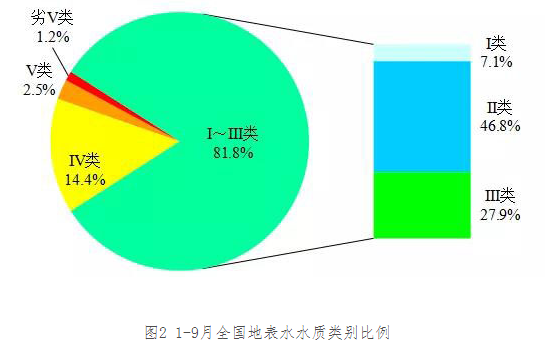 1-9月,3641個(gè)國(guó)家地表水考核斷面中,水質(zhì)優(yōu)良(Ⅰ~Ⅲ類)斷面比例為81.8%,同比上升1.2個(gè)百分點(diǎn);劣Ⅴ類斷面比例為1.2%,同比下降0.9個(gè)百分點(diǎn)。主要污染指標(biāo)為化學(xué)需氧量、高錳酸鹽指數(shù)和總磷。