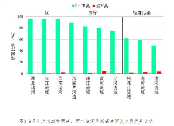 9月,長(zhǎng)江、黃河、珠江、松花江、淮河、海河、遼河等七大流域及西北諸河、西南諸河和浙閩片河流水質(zhì)優(yōu)良(Ⅰ~Ⅲ類)斷面比例為80.3%,同比上升1.7個(gè)百分點(diǎn);劣Ⅴ類斷面比例為1.5%,同比下降1.0個(gè)百分點(diǎn)。主要污染指標(biāo)為高錳酸鹽指數(shù)、化學(xué)需氧量和總磷。其中,西北諸河、長(zhǎng)江流域和西南諸河水質(zhì)為優(yōu);浙閩片河流、珠江、黃河和遼河流域水質(zhì)良好;松花江、海河和淮河流域?yàn)檩p度污染。