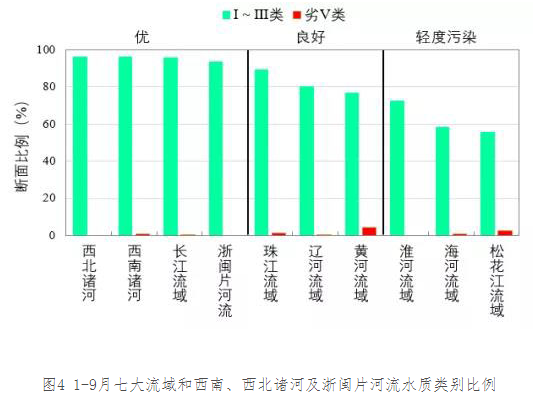 1-9月,長(zhǎng)江、黃河、珠江、松花江、淮河、海河、遼河等七大流域及西北諸河、西南諸河和浙閩片河流水質(zhì)優(yōu)良(Ⅰ~Ⅲ類)斷面比例為83.7%,同比上升1.2個(gè)百分點(diǎn);劣Ⅴ類斷面比例為1.0%,同比下降1.0個(gè)百分點(diǎn)。主要污染指標(biāo)為化學(xué)需氧量、高錳酸鹽指數(shù)和總磷。其中,西北、西南諸河、長(zhǎng)江流域和浙閩片河流水質(zhì)為優(yōu);珠江、遼河和黃河流域水質(zhì)良好;淮河、海河和松花江流域?yàn)檩p度污染。