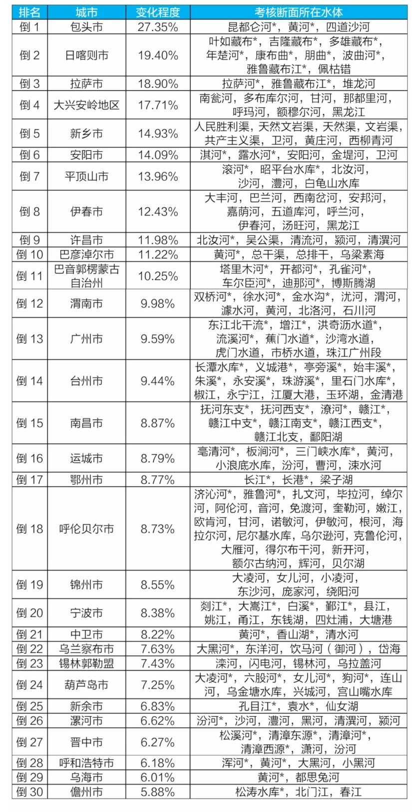 注:國(guó)家地表水考核斷面水環(huán)境質(zhì)量變化情況排名基于城市水質(zhì)指數(shù)的變化程度,正值表示水環(huán)境質(zhì)量變差;按變化程度從大到小的順序進(jìn)行排名,排名越靠前說明水環(huán)境質(zhì)量惡化程度越大。表中帶*水體水質(zhì)達(dá)到《地表水環(huán)境質(zhì)量標(biāo)準(zhǔn)》(GB3838-2002) Ⅰ類或Ⅱ類。