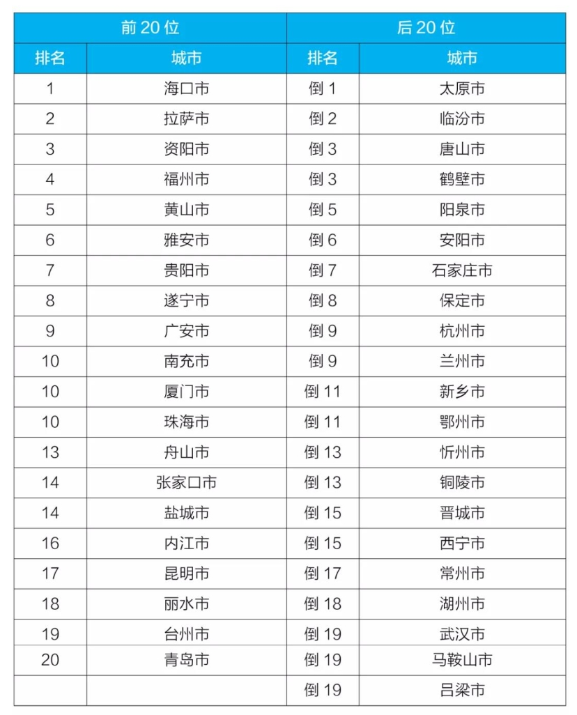 9月,168個(gè)重點(diǎn)城市中,???、拉薩和資陽市等20個(gè)城市空氣質(zhì)量相對(duì)較好(從第1名至第20名);太原、臨汾和唐山市等20個(gè)城市空氣質(zhì)量相對(duì)較差(從倒數(shù)第1名至并列倒數(shù)第19名),見附表5。