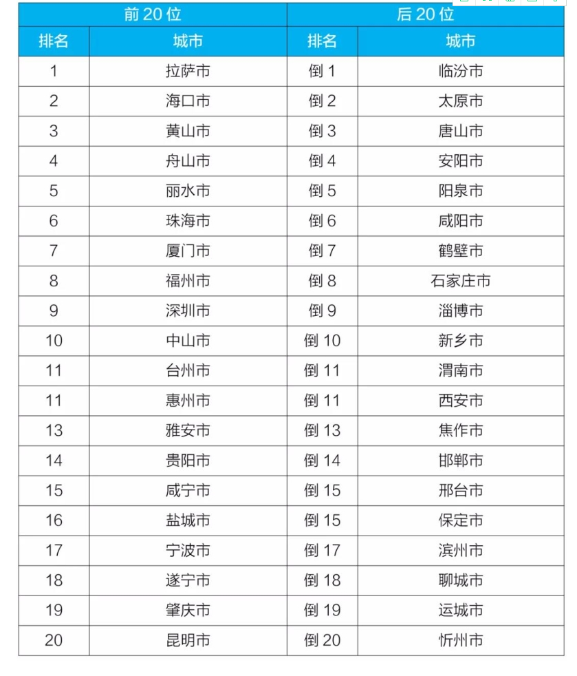 9月168個(gè)重點(diǎn)城市空氣質(zhì)量排名前20位和后20位城市名單