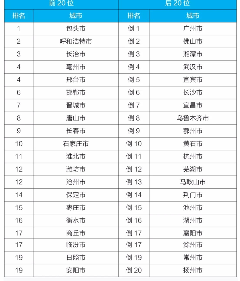 1-9月,168個(gè)重點(diǎn)城市中,拉薩、??诤忘S山市等20個(gè)城市空氣質(zhì)量相對(duì)較好(從第1名至第20名);臨汾、太原和唐山市等20個(gè)城市空氣質(zhì)量相對(duì)較差(從倒數(shù)第1名至倒數(shù)第20名),見附表6。包頭、呼和浩特、長(zhǎng)治市等城市空氣質(zhì)量變化情況相對(duì)較好(從第1名至并列第19名);廣州、佛山、湘潭市等城市空氣質(zhì)量變化情況相對(duì)較差(從倒數(shù)第1名至倒數(shù)第20名),見附表7。