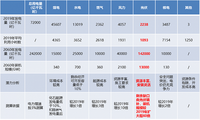 按最保守估算,電力消費(fèi)年均增速3%,預(yù)計(jì)到2060年,中國電力年消費(fèi)量將超過24萬億千瓦時。根據(jù)現(xiàn)在可以預(yù)測的能源相關(guān)技術(shù),我們對發(fā)電側(cè)各能源逐項(xiàng)進(jìn)行分析,大致如下。