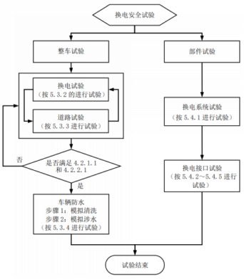 《要求》包括安全要求、試驗方法及檢驗規(guī)則,其中安全要求涉及一般要求、整車要求和部件要求,分別規(guī)定了5000次(卡扣式)和1500次(螺栓式)的最低換電次數(shù)要求。換電安全試驗流程如下:
