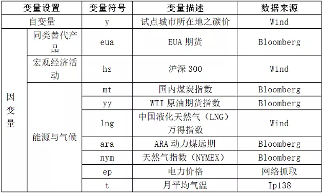 回顧上述文獻可以發(fā)現(xiàn),多數(shù)國內(nèi)外學者的研究證實了同類替代品、宏觀經(jīng)濟活動、能源與氣候變化會對碳價有較為顯著的影響。為了進一步探究這一系列影響因素對碳價的共同影響,并比較其相關性,本文將在這三個層面選取部分代表性指標,并將其聯(lián)立以分析影響結果。