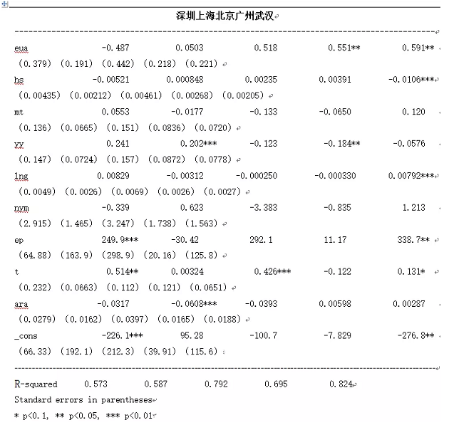 在篩選掉缺失數(shù)據(jù)并統(tǒng)一時間與貨幣單位后,本文最終對深圳、上海、北京、廣東、以及湖北在2017年1月至2021年1月這四年間的日度數(shù)據(jù)進行回歸。研究發(fā)現(xiàn),五次回歸模型在F檢驗中的P值均<0.01,可見此模型均在0.01水平上是有效的。其次,深圳、上海、北京、廣東、以及湖北在以一系列應變量的回歸模型中R方分別為0.5730、0.5871、0.7920、0.6952、0.8243,盡管相對于宏觀層面R方的大小并不是很大,但具有一定的解釋意義。