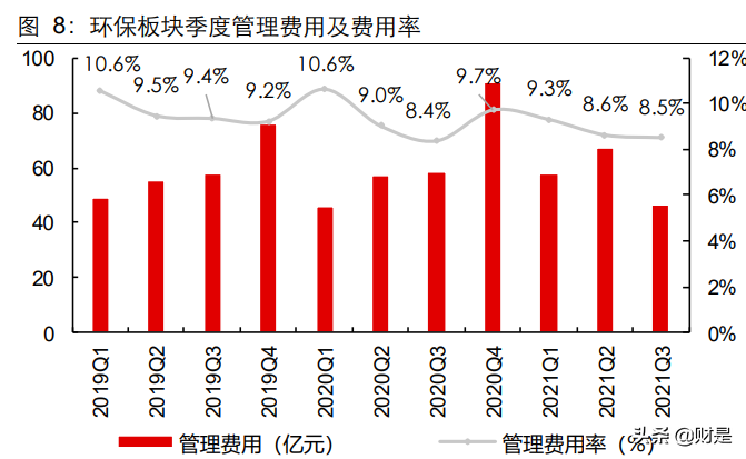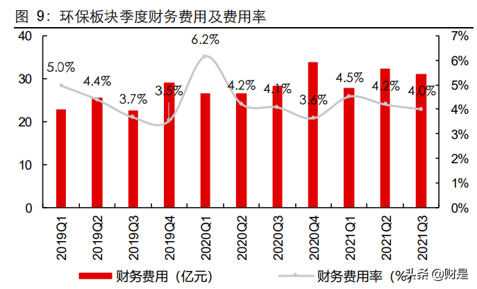 費(fèi)用端得到控制:2021Q1-Q3環(huán)保板塊期間費(fèi)用累計(jì)支出為361.8億元,同比增14.6%, 期間費(fèi)用率同比降1.2pct至15.7%。費(fèi)用率方面,銷售費(fèi)用率 2.8%,同比降0.41pct;管理費(fèi)用(含研發(fā)費(fèi)用,下同)率8.8%,同比降 0.37pct;財(cái)務(wù)費(fèi)用率4.1%,同比降0.41pct。期間費(fèi)用率同比下行的主要原因是:疫情后,收入同比大幅增長23.3%,致期間費(fèi)用率顯著下行。