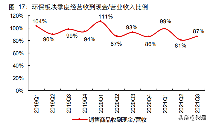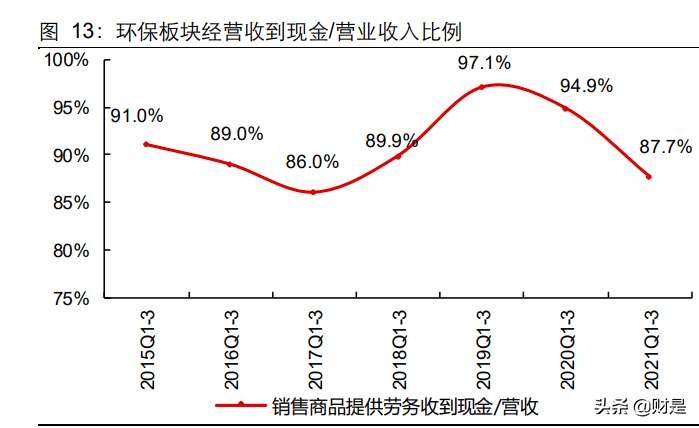 2021Q1-Q3 環(huán)保板塊銷售商品收到現(xiàn)金/營收比率(收現(xiàn)比)為 87.7%,同比降 7.2pct,處于歷史數(shù)據(jù)區(qū)間內(nèi);經(jīng)營活動(dòng)、投資活動(dòng)及籌資活動(dòng)產(chǎn)生的現(xiàn)金流量凈額分別 151 億 元(去年同期為 206 億元,同比降 27%)、-526 億元(去年同期為-680億元,凈支出同 比減少 23%)和 197 億元(去年同期為 540 億元,同比降 64%)。