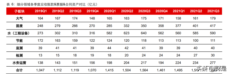 考慮到當(dāng)下部分公司將實(shí)質(zhì)的應(yīng)收賬款名義上放至存貨科目名下,故我們考慮存貨后, 2021Q3 末應(yīng)收賬款&票據(jù)+存貨+合同資產(chǎn)同比增 4.9%,(應(yīng)收賬款&票據(jù)+存貨+合同 資產(chǎn))/營業(yè)收入同比降16.8pct,變動(dòng)原因:1)水(工程設(shè)備)、節(jié)能、大氣的(應(yīng)收賬款&票據(jù)+存貨+合同資產(chǎn))絕對值有所下降,分別降 6.6%、6.4%、1.6%,強(qiáng)化了回款;2)各子行業(yè) 2021Q1-Q3 均獲得營收正增長,行業(yè)整體同比增 23.3%,特別是檢 測、水(工程設(shè)備)的同比增速在 30%以上。