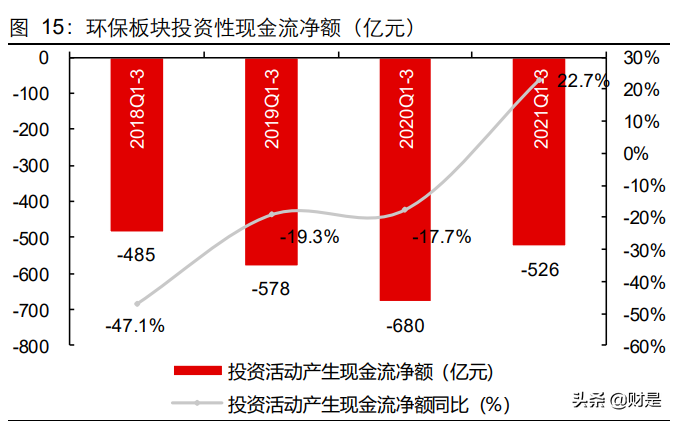 2021Q1-Q3環(huán)保板塊投資活動(dòng)凈支出同比降 23%達(dá) 526 億元,主要是水(工程設(shè)備)方向的投資性凈支出大幅下降,2021Q1-Q3 的支出為 35 億元,遠(yuǎn)低于2020Q1-Q3 的 114 億元;而固廢、水務(wù)運(yùn)營板塊的投資活動(dòng)現(xiàn)金流凈支出分別達(dá)205/186億元,同比存在一定程度下降,但仍保持了相當(dāng)規(guī)模,與該兩個(gè)方向仍處于成長期有關(guān),預(yù)計(jì)資本開支的需求將維持;投資活動(dòng)現(xiàn)金流也反映了資金投向的項(xiàng)目整體質(zhì)量有所提升。