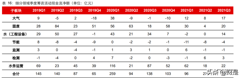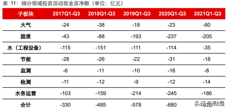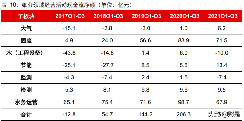 2021Q1-Q3 環(huán)保經(jīng)營活動(dòng)現(xiàn)金流凈額為 151 億元,同比降 27%,主要因水務(wù)運(yùn)營下降較多,水(工程設(shè)備)、監(jiān)測為凈流出。