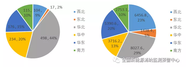 三季度各區(qū)域新增(左)、累計(jì)(右)并網(wǎng)光伏發(fā)電裝機(jī)(萬千瓦)