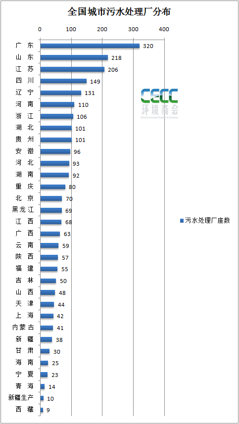 截至2020年,全國城市污水處理能力分布(按照各省市污水處理廠數(shù)量排序):