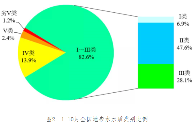 1-10月,3641個(gè)國(guó)家地表水考核斷面中,水質(zhì)優(yōu)良(Ⅰ~Ⅲ類(lèi))斷面比例為82.6%,同比上升1.2個(gè)百分點(diǎn);劣Ⅴ類(lèi)斷面比例為1.2%,同比下降0.8個(gè)百分點(diǎn)。主要污染指標(biāo)為化學(xué)需氧量、高錳酸鹽指數(shù)和總磷。