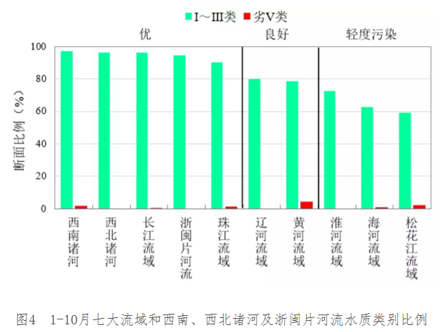 1-10月,長(zhǎng)江、黃河、珠江、松花江、淮河、海河、遼河等七大流域及西北諸河、西南諸河和浙閩片河流水質(zhì)優(yōu)良(Ⅰ~Ⅲ類(lèi))斷面比例為84.8%,同比上升1.4個(gè)百分點(diǎn);劣Ⅴ類(lèi)斷面比例為0.9%,同比下降1.0個(gè)百分點(diǎn)。主要污染指標(biāo)為化學(xué)需氧量、高錳酸鹽指數(shù)和總磷。其中,西南和西北諸河、長(zhǎng)江流域、浙閩片河流和珠江流域水質(zhì)為優(yōu);遼河和黃河流域水質(zhì)良好;松花江、海河和淮河流域?yàn)檩p度污染。