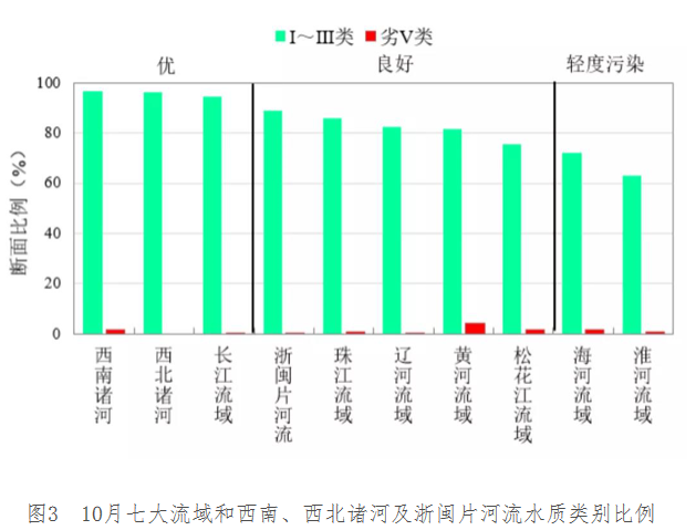 10月,長(zhǎng)江、黃河、珠江、松花江、淮河、海河、遼河等七大流域及西北諸河、西南諸河和浙閩片河流水質(zhì)優(yōu)良(Ⅰ~Ⅲ類(lèi))斷面比例為84.8%,同比下降0.5個(gè)百分點(diǎn);劣Ⅴ類(lèi)斷面比例為1.0%,同比下降0.3個(gè)百分點(diǎn)。主要污染指標(biāo)為高錳酸鹽指數(shù)、總磷和化學(xué)需氧量。其中,西南和西北諸河、長(zhǎng)江流域水質(zhì)為優(yōu);浙閩片河流、珠江、遼河、黃河和松花江流域水質(zhì)良好;淮河和海河流域?yàn)檩p度污染。