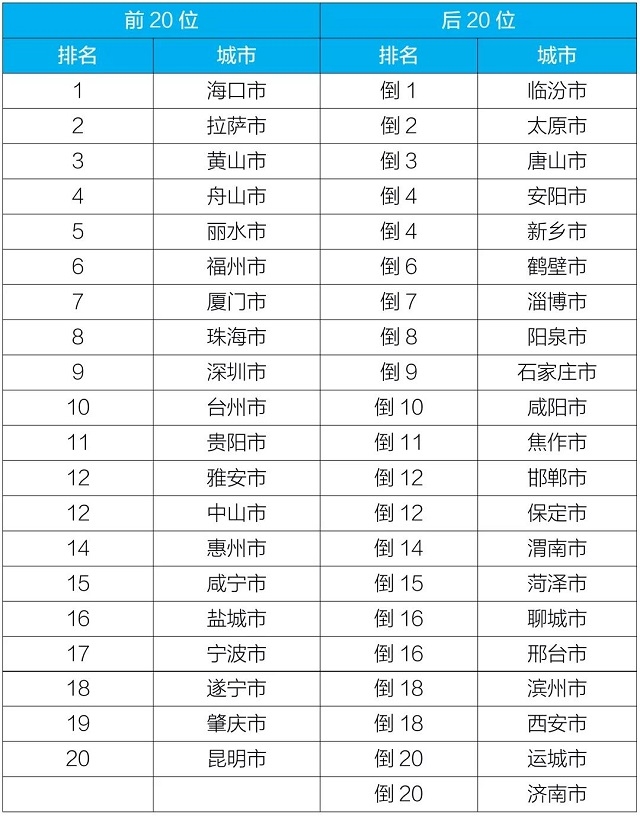 1-10月,168個(gè)重點(diǎn)城市中,??凇⒗_和黃山市等20個(gè)城市空氣質(zhì)量相對(duì)較好(從第1名至第20名),臨汾、太原和唐山市等20個(gè)城市空氣質(zhì)量相對(duì)較差(從倒數(shù)第1名至并列倒數(shù)第20名),見(jiàn)附表4。