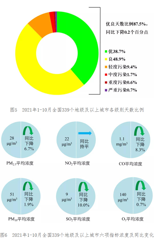 1-10月,全國(guó)339個(gè)地級(jí)及以上城市平均優(yōu)良天數(shù)比例為87.5%,同比下降0.2個(gè)百分點(diǎn);PM2.5平均濃度為28微克/立方米,同比下降6.7%;PM10平均濃度為51微克/立方米,同比下降1.9%;O3平均濃度為140微克/立方米,同比下降0.7%;SO2平均濃度為9微克/立方米,同比下降10.0%;NO2平均濃度為22微克/立方米,同比持平;CO平均濃度為1.1毫克/立方米,同比下降8.3%。