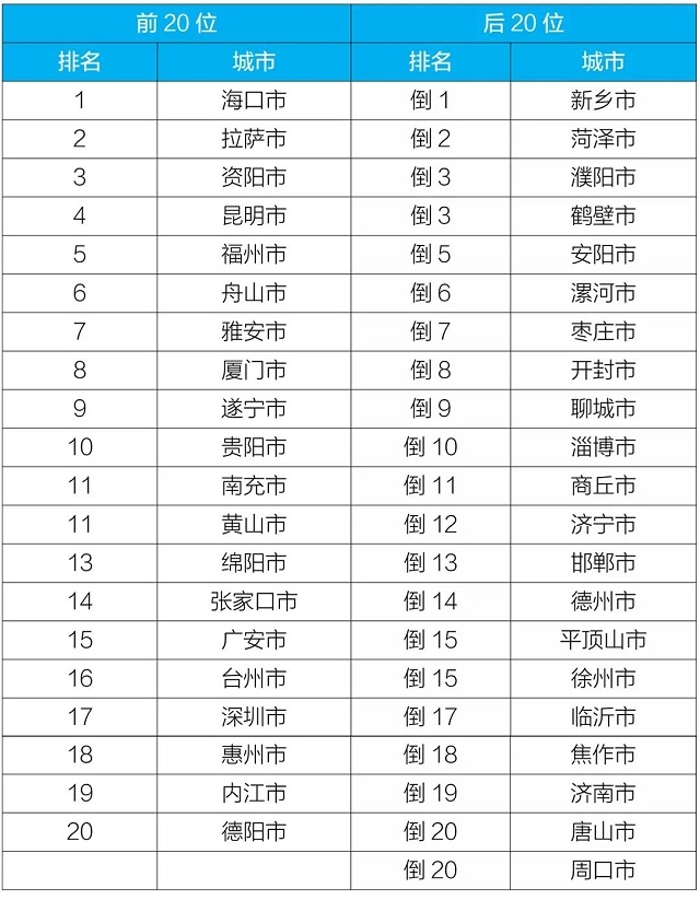 10月,168個(gè)重點(diǎn)城市中,???、拉薩和資陽(yáng)市等20個(gè)城市空氣質(zhì)量相對(duì)較好(從第1名至第20名),新鄉(xiāng)、菏澤和濮陽(yáng)市等20個(gè)城市空氣質(zhì)量相對(duì)較差(從倒數(shù)第1名至并列倒數(shù)第20名),見(jiàn)附表3。