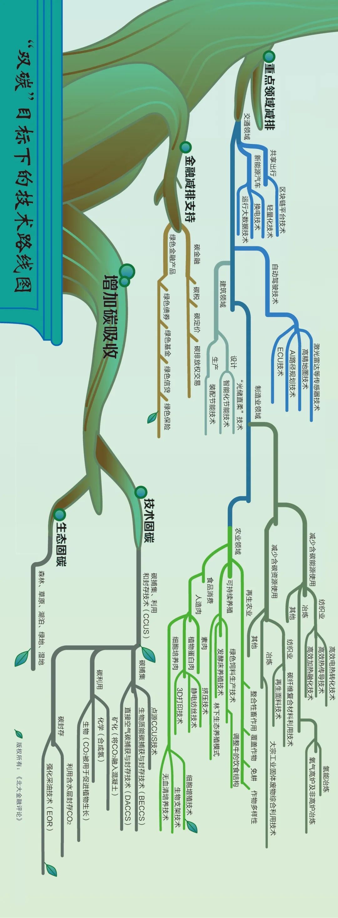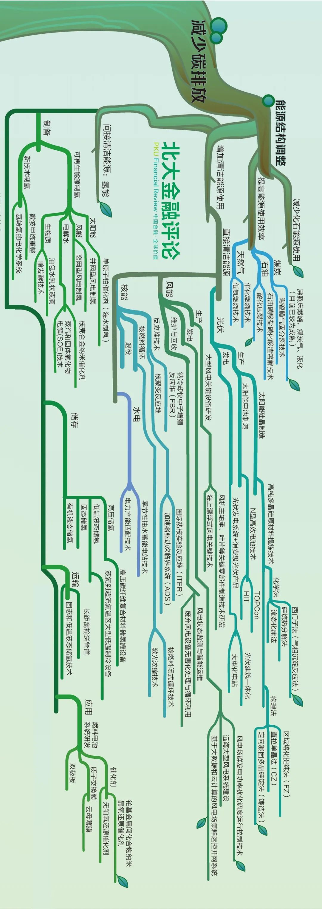 近日,《北大金融評論》發(fā)布“雙碳”目標(biāo)下的技術(shù)路線圖,包括減少碳排放和增加碳吸收2條主路線。其中,減少碳排放包括能源結(jié)構(gòu)調(diào)整、重點(diǎn)領(lǐng)域減排和金融減排支持3條路線,增加碳吸收又包括技術(shù)固碳和生態(tài)固碳2條路線。如此逐級細(xì)化,得到完整技術(shù)路線圖。